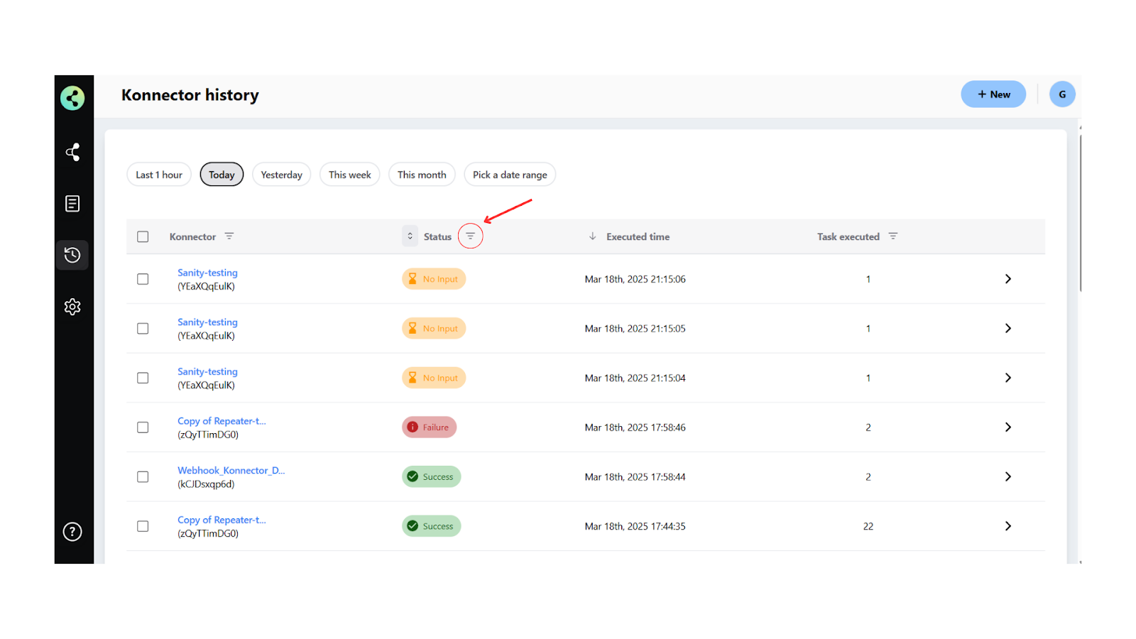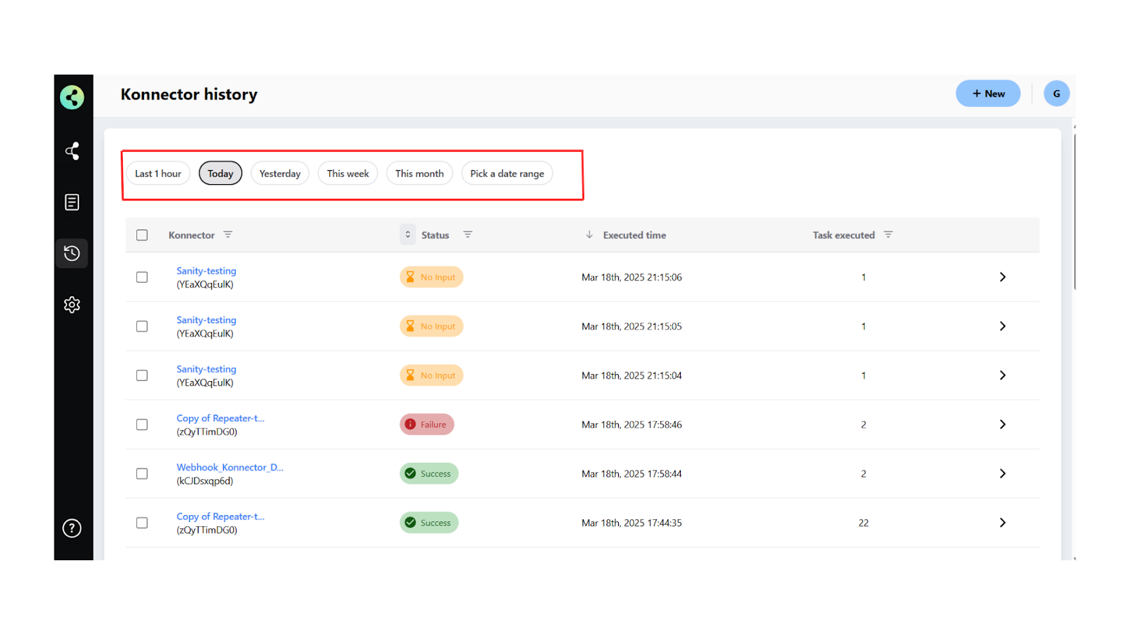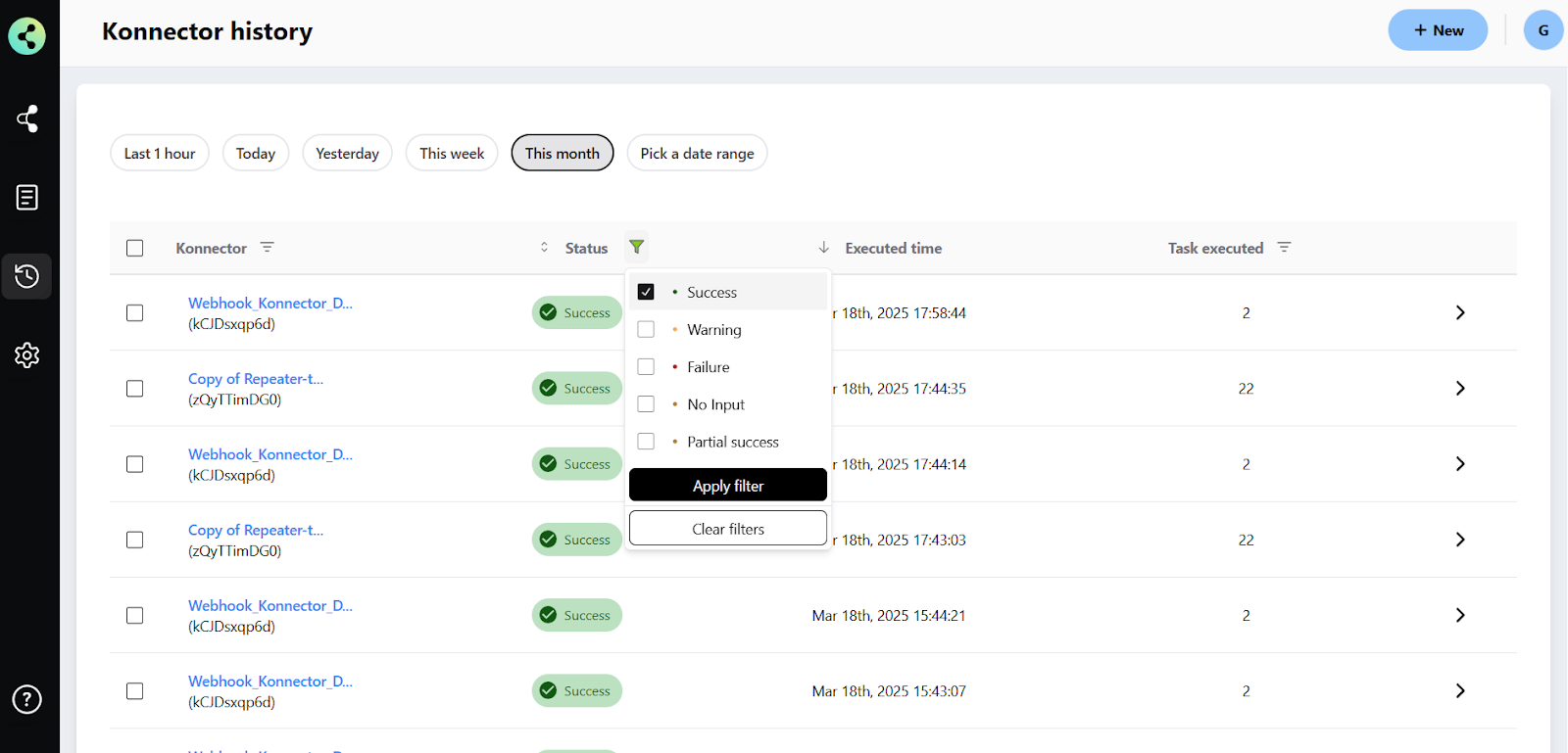 After selecting the filters for time, status, and task, click the Apply Filters button to update your history view. The Konnector History will now display only the records that match your selected criteria.