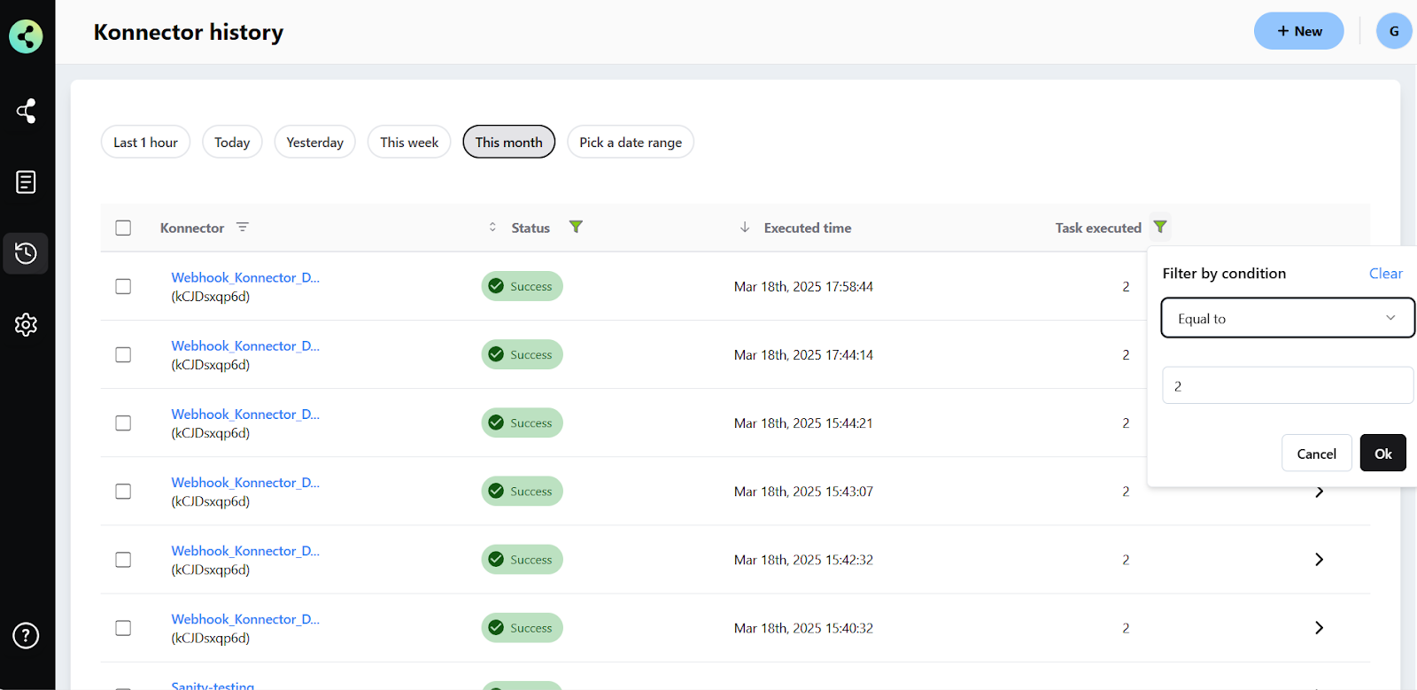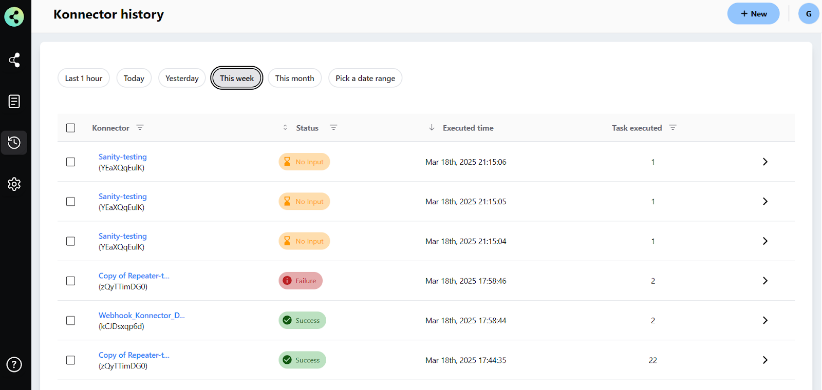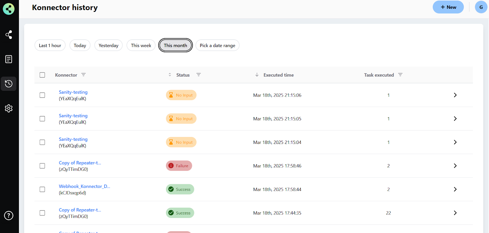After selecting the filters for time, status, and task, click the Apply Filters button to update your history view. The Konnector History will now display only the records that match your selected criteria.