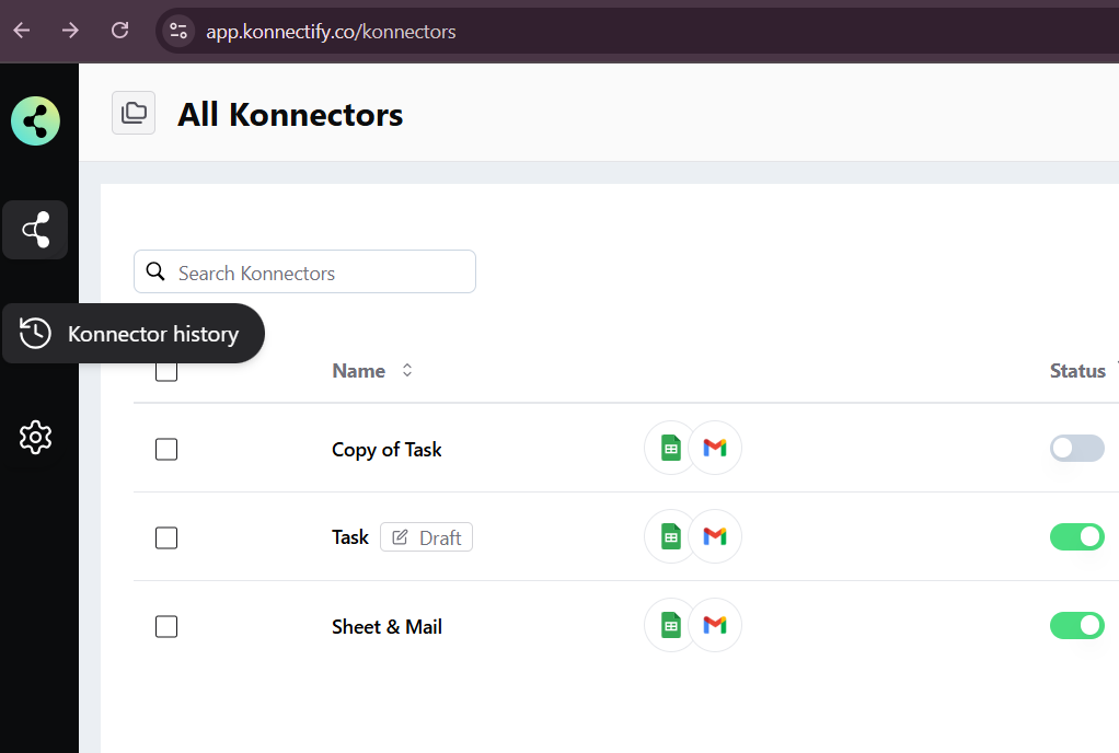 Locate and click on the Konnector History section to view the history of all actions and events performed through your connectors.