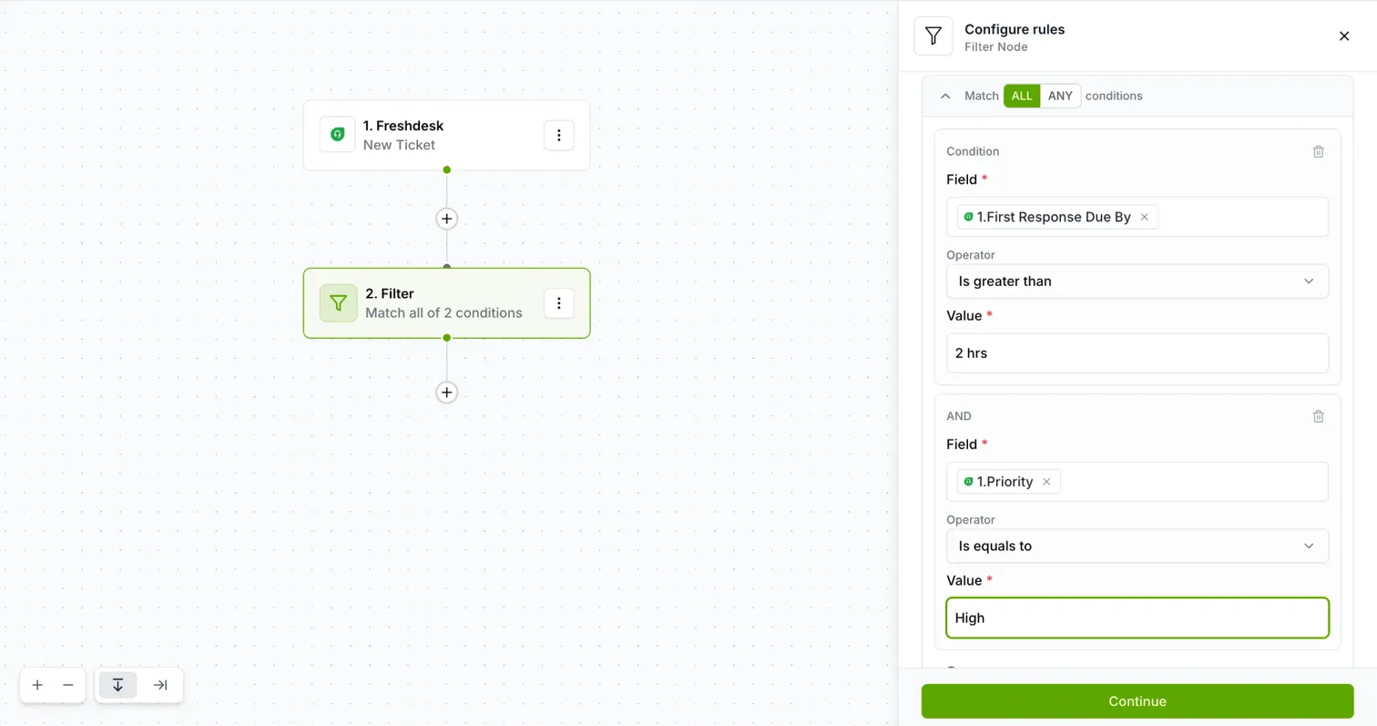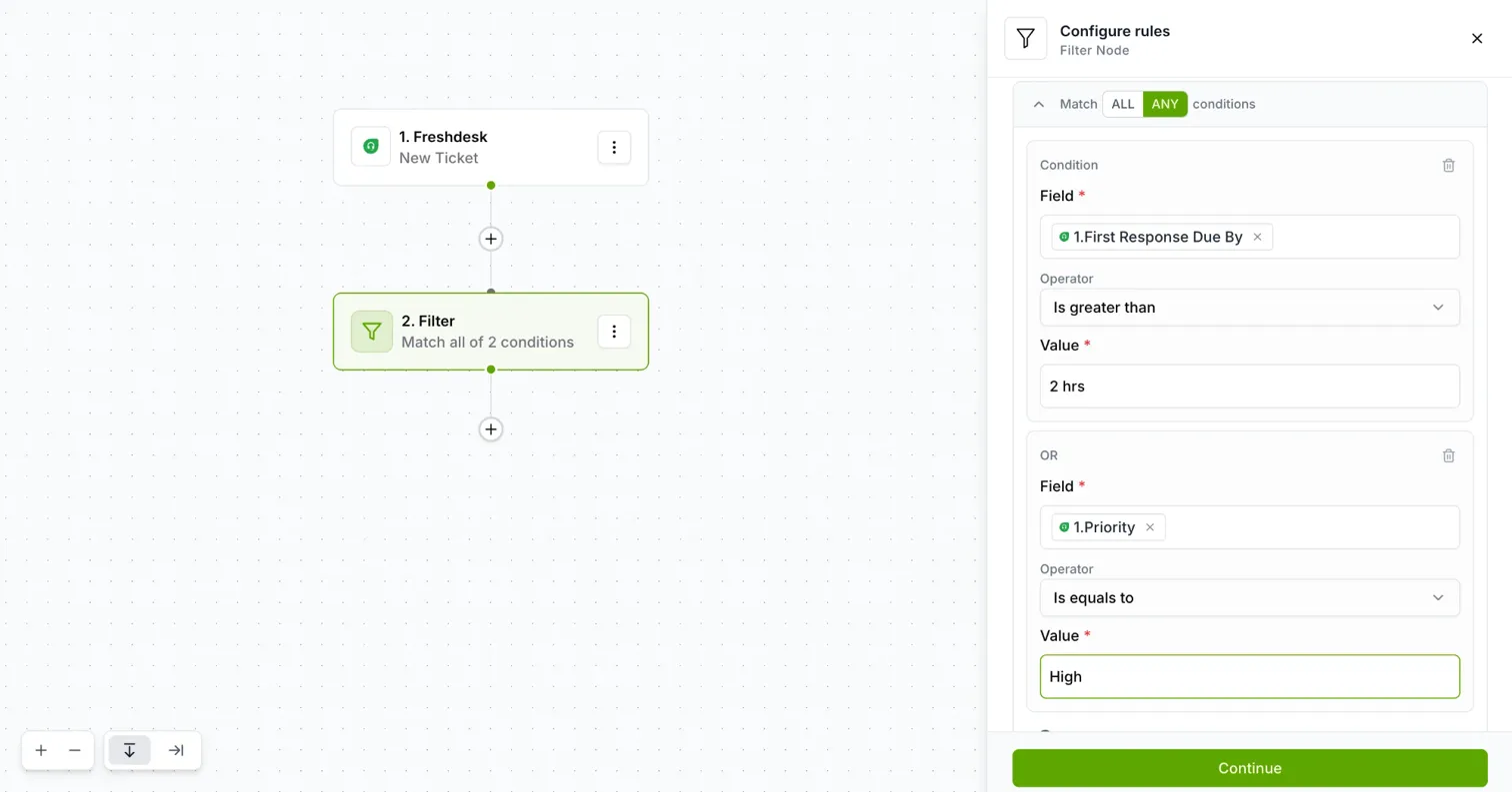 Node 1: Your trigger (e.g., Freshdesk - New Ticket)