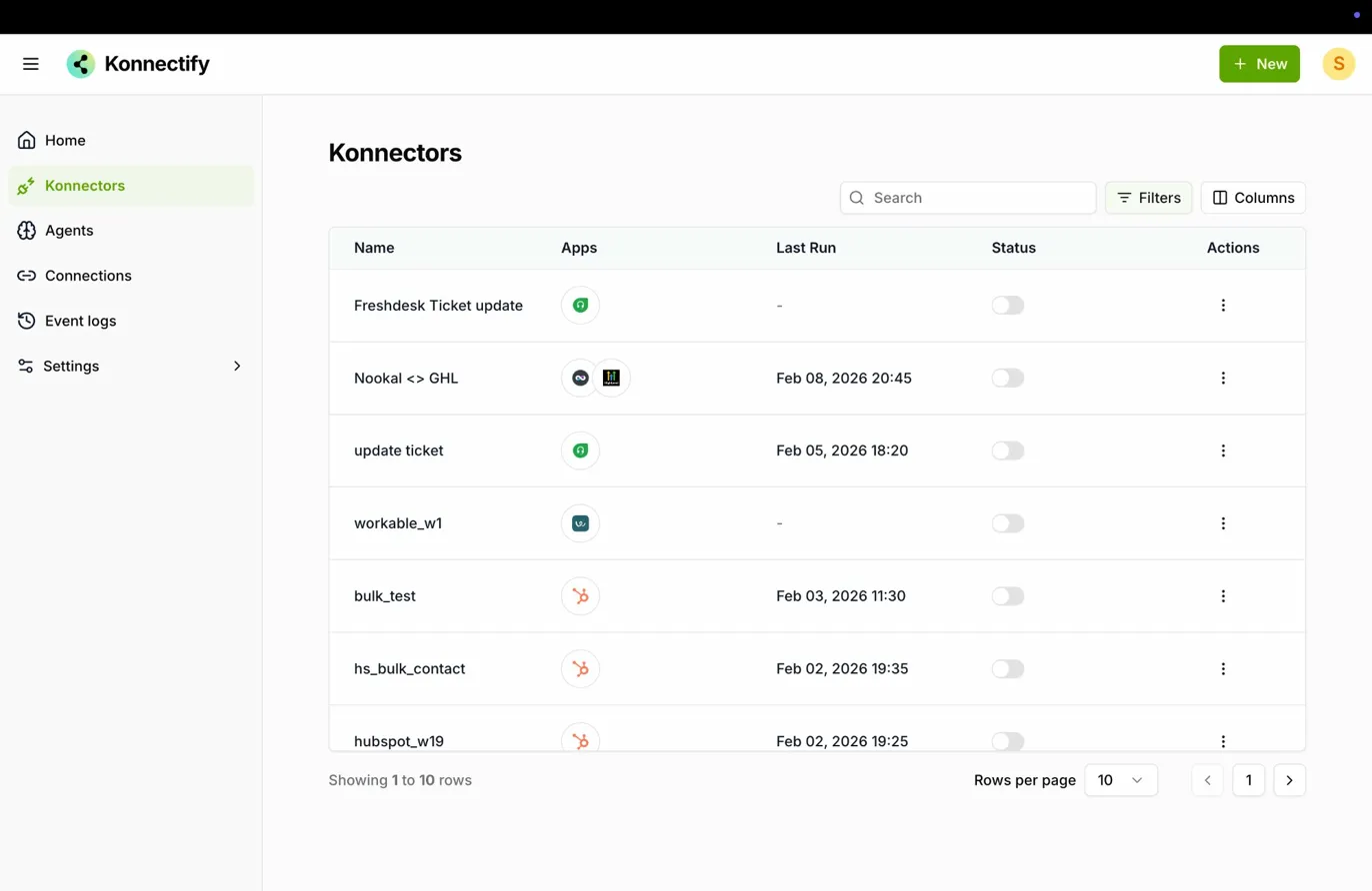 Once logged in, click on Konnectors in the left sidebar. This opens the Konnectors list showing all your existing automations.