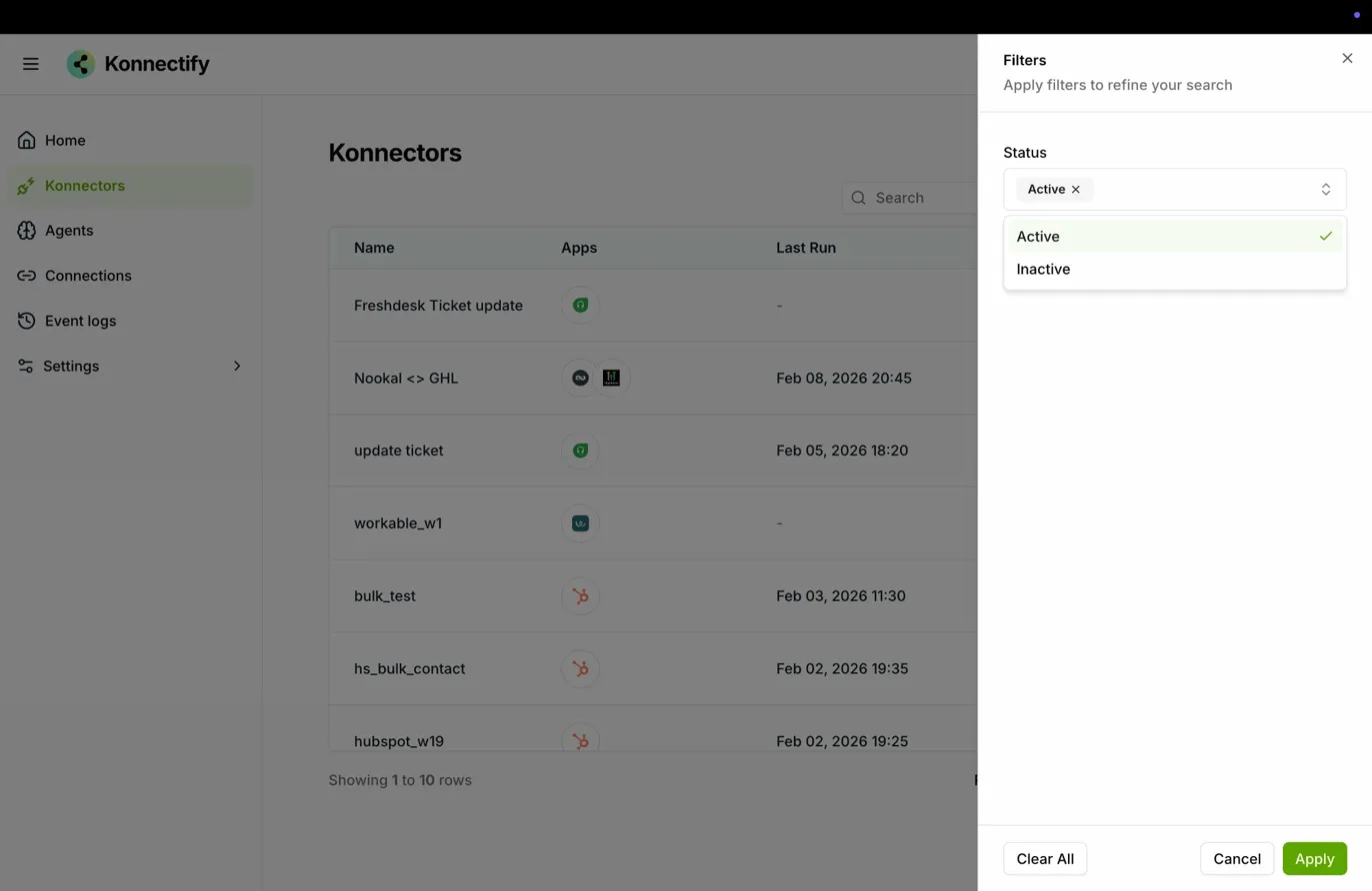 Once you have selected your desired criteria, click the Apply button at the bottom of the filter panel. The Konnectors list will refresh and display only the results that match your filters.
