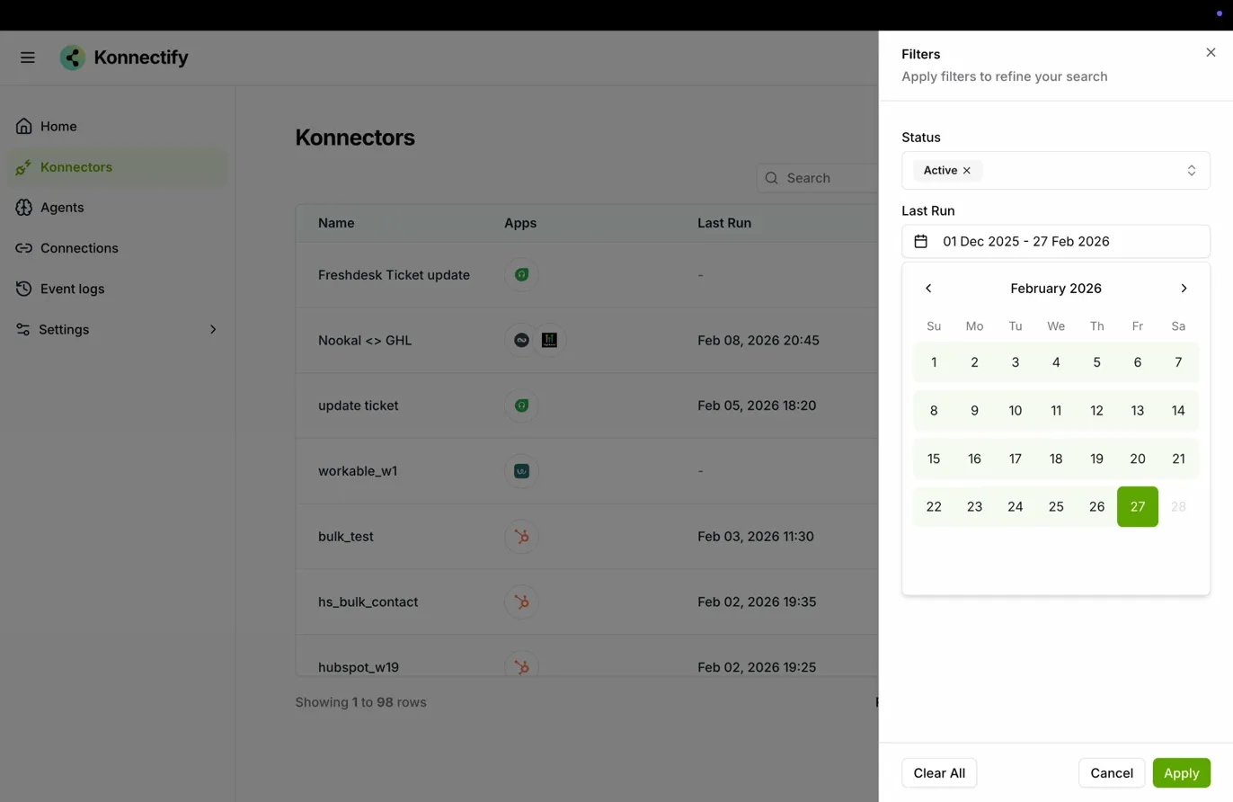 Select a date range using the calendar picker to find Konnectors that ran within a specific time period.