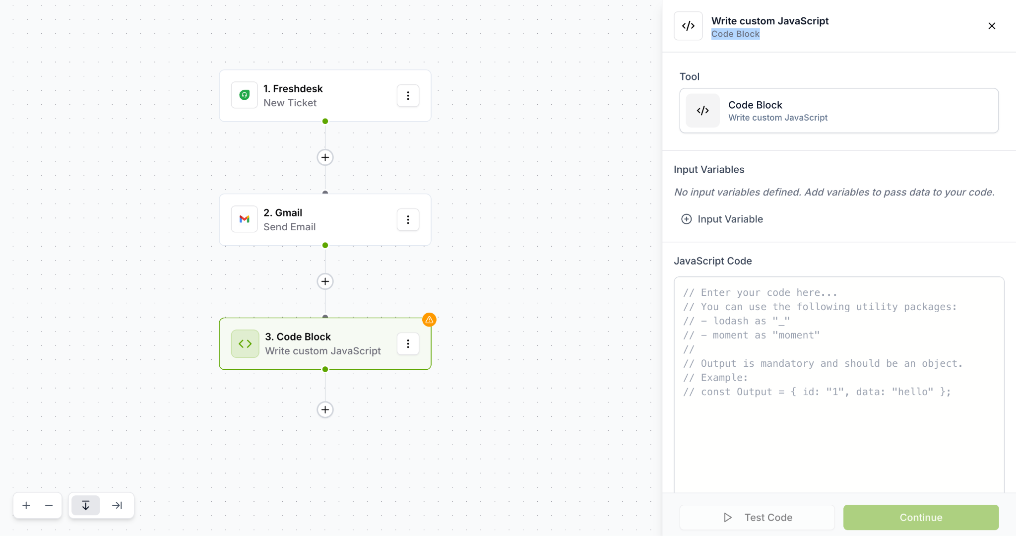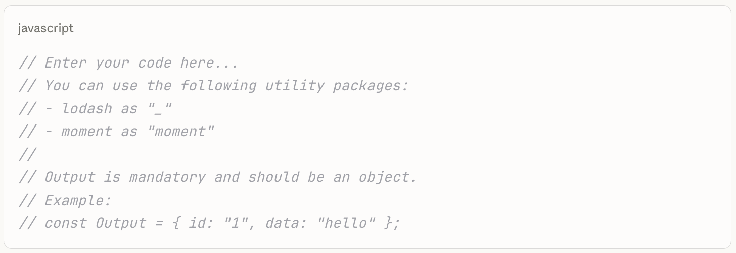 Use a Code Block when standard field mapping cannot express the logic you need. It is an advanced node suited for developers comfortable with JavaScript.