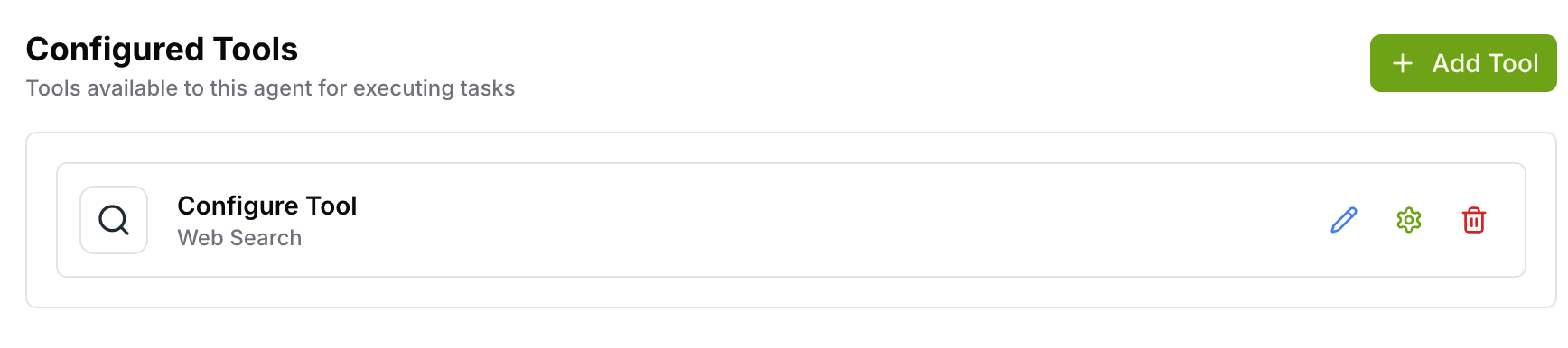 When adding the Web Search tool to an agent, three fields must be configured. Each one shapes how the agent identifies, invokes, and uses the tool during execution.