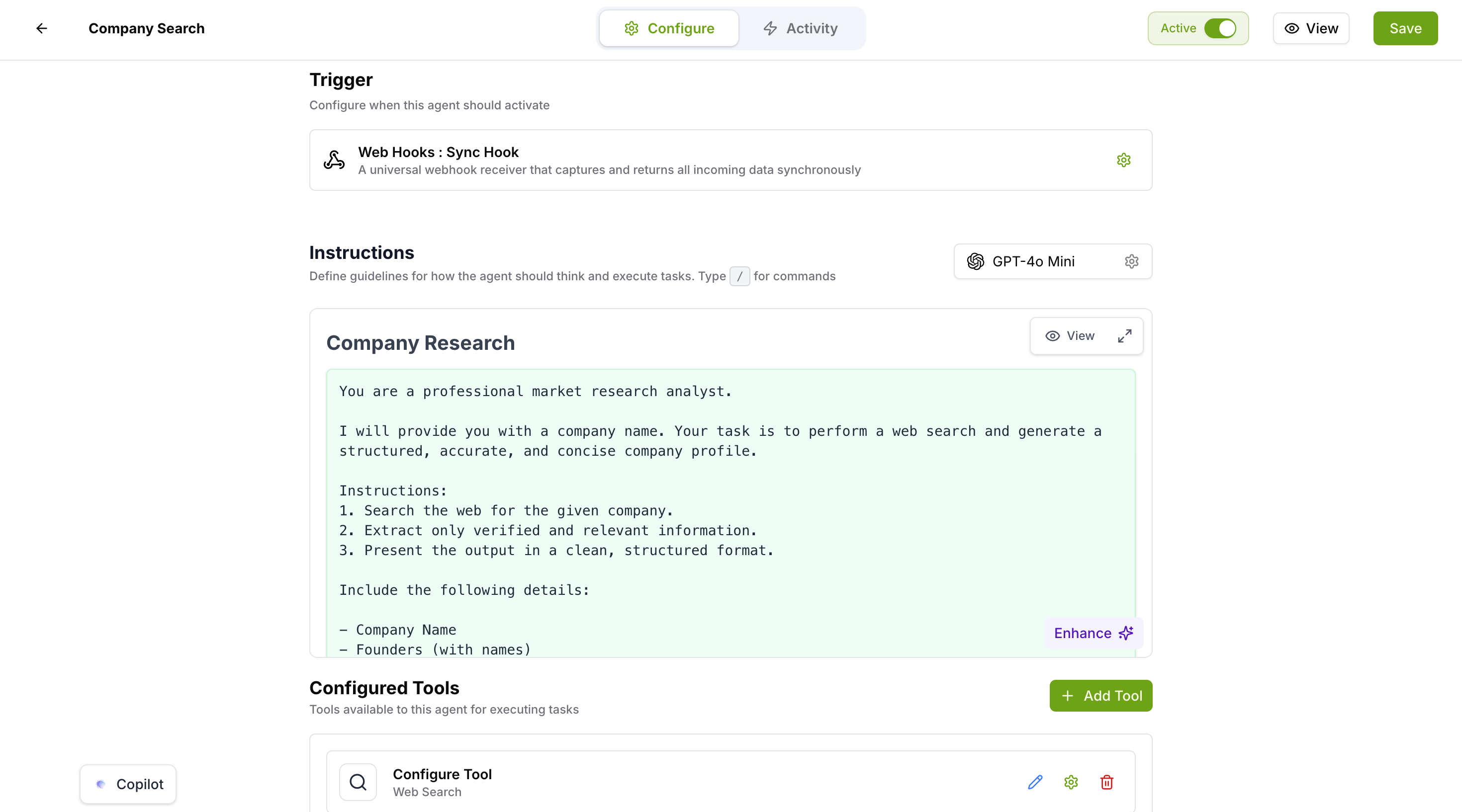 The following is a ready-to-use instruction you can paste into the Instructions field when configuring the Web Search tool for a Company Research use case. Adapt it for your own needs.