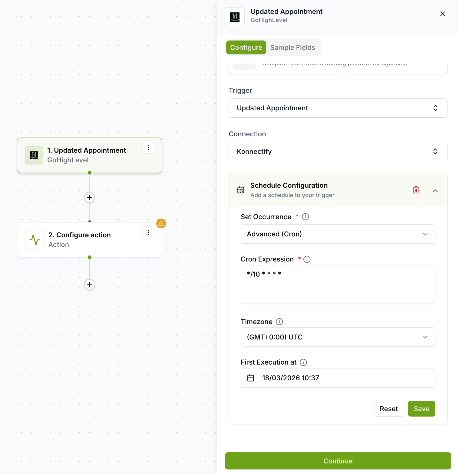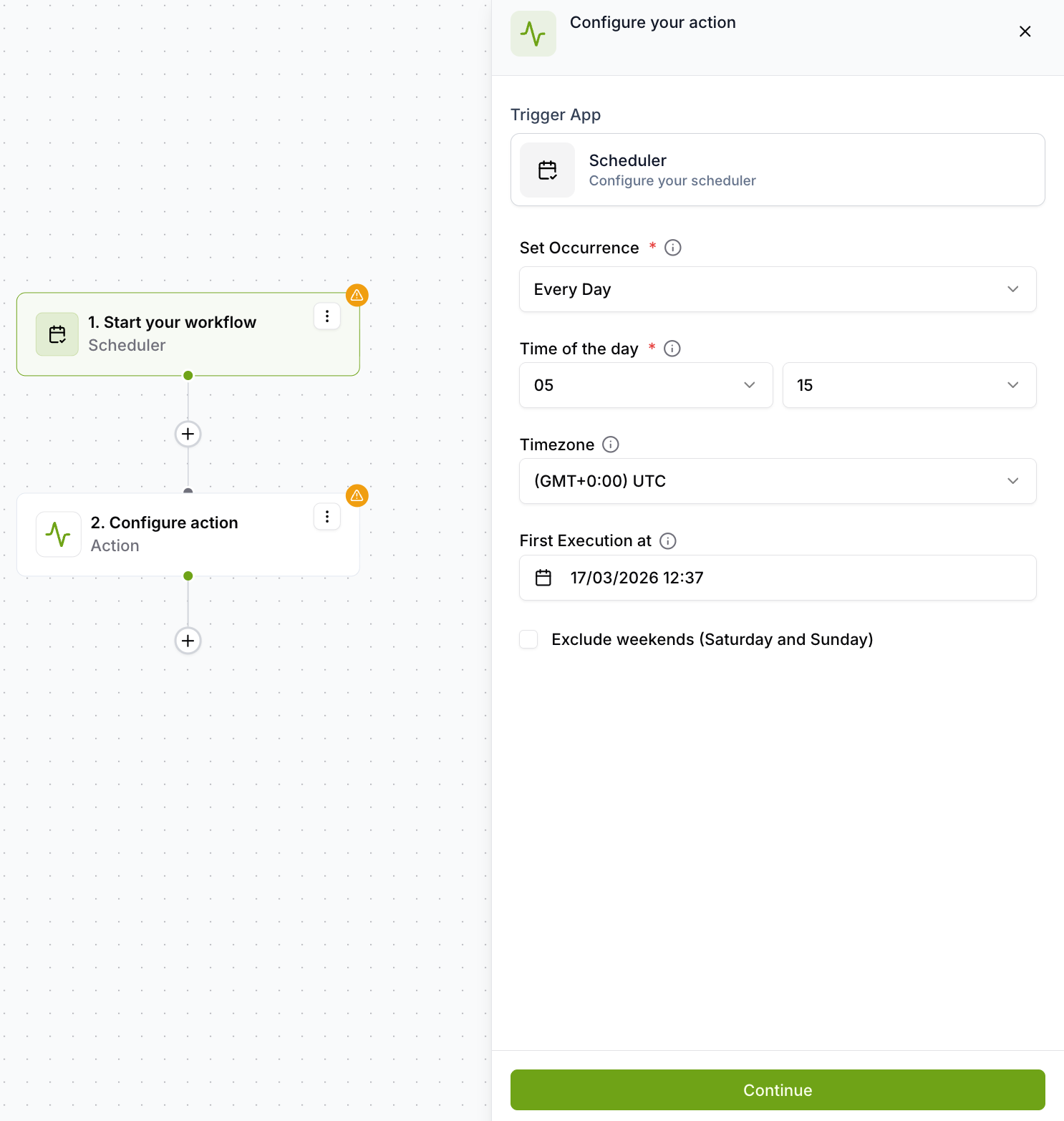Click Continue to save the scheduler configuration. If validation fails, invalid fields are highlighted in the sidebar and the schedule is not saved.
