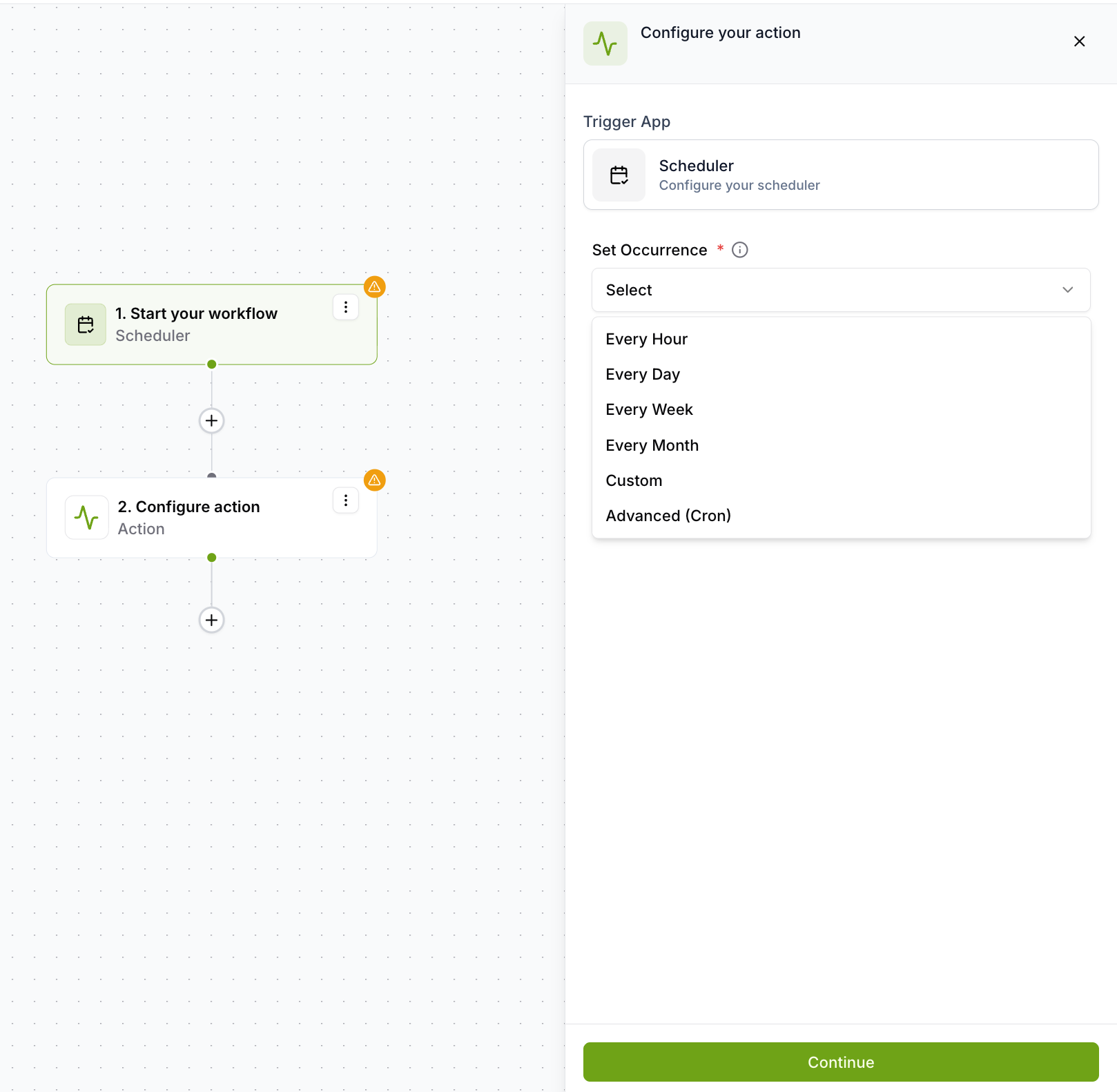 The Scheduler is a time-based automation feature in the workflow builder. It allows you to control when a workflow should run or when a polling trigger should check for new data. It supports simple recurring intervals — hourly, daily, weekly, and monthly, as well as flexible custom and advanced cron-based options.
